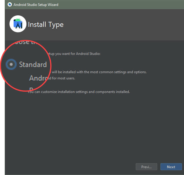 - Ejecuta el instalador y usa el botón «Next» para avanzar en cada paso del proceso. En primer lugar, tras pasar las primeras pantallas de introducción, selecciona el tipo de instalación «Standard», suficiente para que se instale el emulador de Android Studio y sus componentes. Deberás esperar a que se descaguen e instalen todos estos componentes (otros 700MB – 1GB aproximadamente).