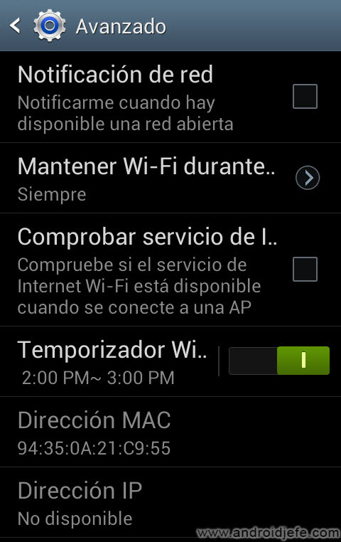 Imágenes arriba: Activar WiFi según horario en Samsung Galaxy S3 mini con Android 4.1.2 (Jelly Bean). Opción Temporizador Wifi (Conectar/Desconectar automáticamente de la red Wifi debe estar activada.