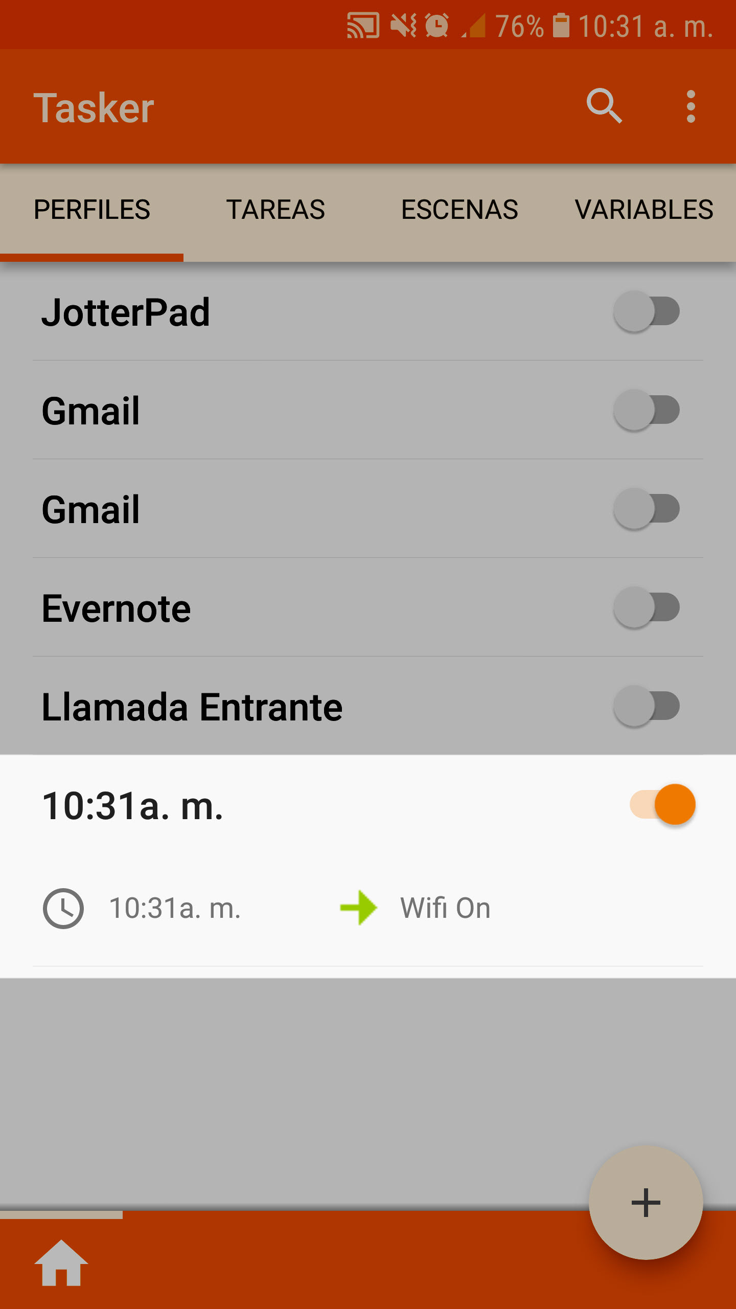 En este caso el programa es simple. Toca en el «+» para crear un perfil, elige «Hora» y selecciona el espacio de tiempo (o una misma hora). Ahora presiona en la flecha de regresar, toca en «Nueva Tarea» y pon un nombre cualquiera. Finalmente toca en el «+» para añadir una acción, escoge «Red», «WiFi» e indicas si quieres «Apagarlo» o «Encenderlo». Si regresas un par de veces tu perfil ya estará creado y listo para entrar en ejecución a la hora programada.