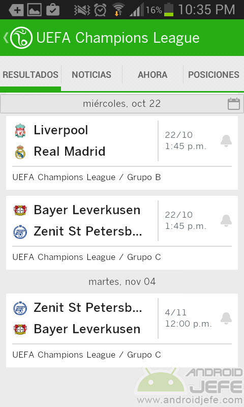 Esta es una de las aplicaciones más completas. Con ella podrás saber resultados de fútbol de cualquier país del mundo. Incluso de competencias famosas como la Premier o Champions. Incluso te servirá para conocer los resultados del mundial. Además, te informará hora y fecha de partidos siguientes y activar alarmas para avisar de los próximos partidos (aunque la aplicación requiere conexión a internet para esto). También tienes noticias recientes en la misma App.