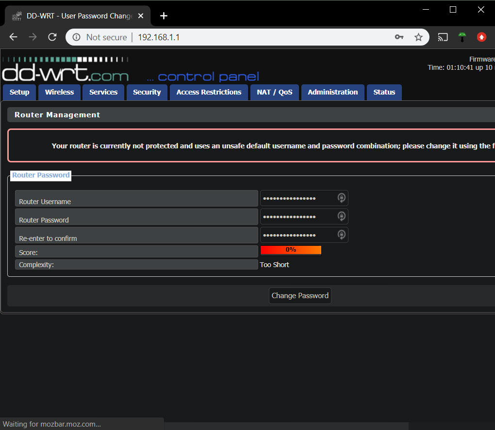 6. Una vez completado el proceso, revisa que puedas ingresar a la nueva página de configuración del router. El nuevo firmware DD-WRT cambiará la IP del router a 192.168.1.1. Por lo tanto, si ya no puedes ingresar, en el dispositivo o PC que estás usando para acceder deberás ajustar manualmente su IP para que esté dentro del rango de la IP del router. Es decir, deberás usar una IP como 192.168.1.2, o en vez del 2 final cualquier número hasta el 255. En la pantalla de inicio de sesión podrás configurar un nuevo usuario y contraseña, pero puedes omitir este paso y usar el usuario y contraseña por defecto, que es root y admin respectivamente.