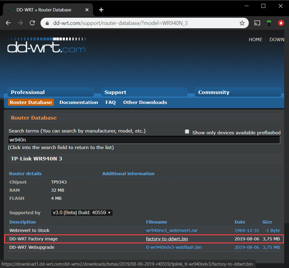 2. Descarga el firmware. En el caso de DD-WRT, debes ir a la base de datos de routers e ingresar el modelo de tu router. En la siguiente pantalla escoge la versión de tu router (la encontrarás junto al modelo en la etiqueta pegada en la parte posterior). Entre los archivos disponibles, escoge el archivo DD-WRT Factory Image.