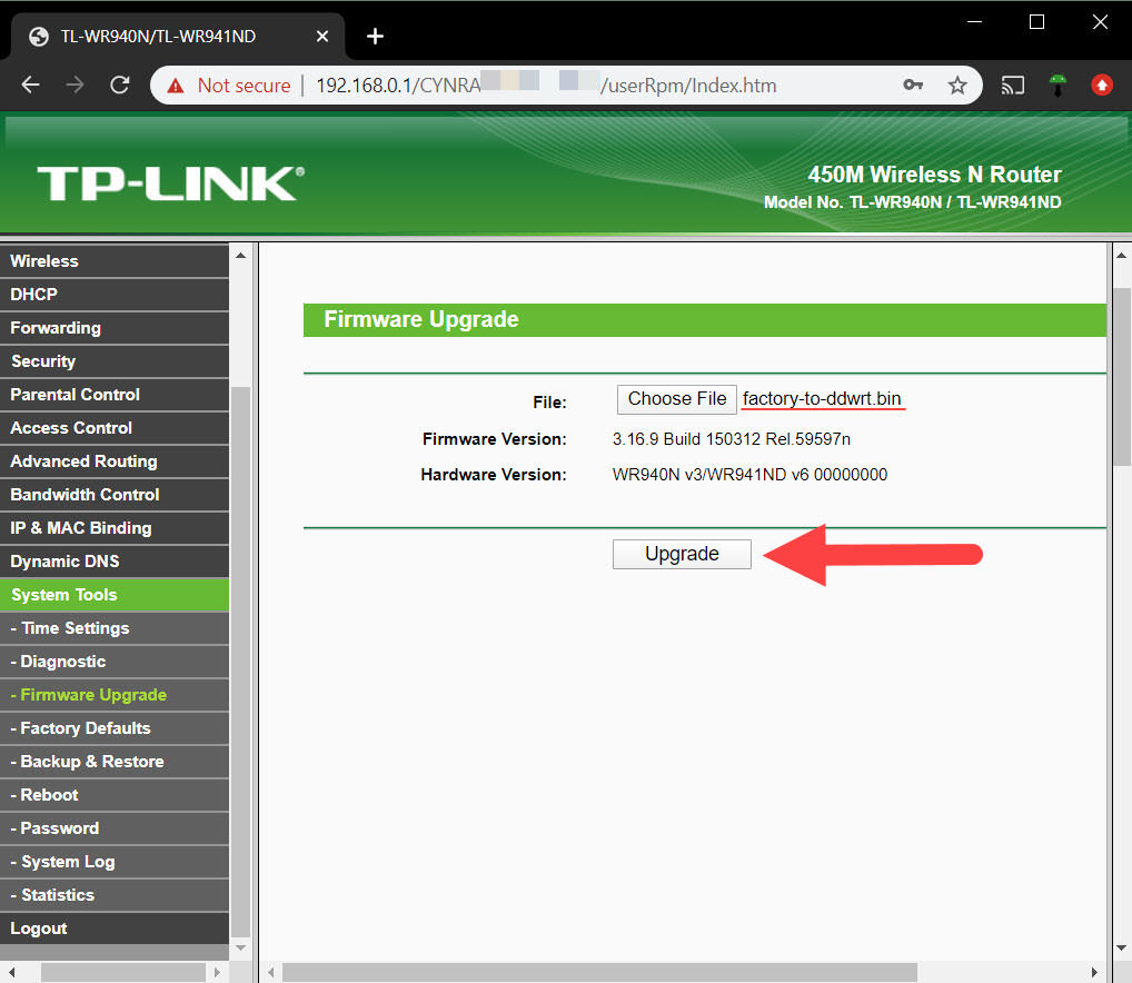 5. Desde el botón «Buscar», ubica y escoge el archivo .bin descargado. Haz clic en «Upgrade». Es posible que el firmware se flashee inmediatamente. Si te aparece la opción «Continuar», espera al menos cinco minutos antes de hacer clic sobre ella, tras lo cual el flasheo debería realizarse. Asegúrate de no interrumpir el proceso. No cierres la pestaña del navegador, permitas que se desconecte o apague el router.