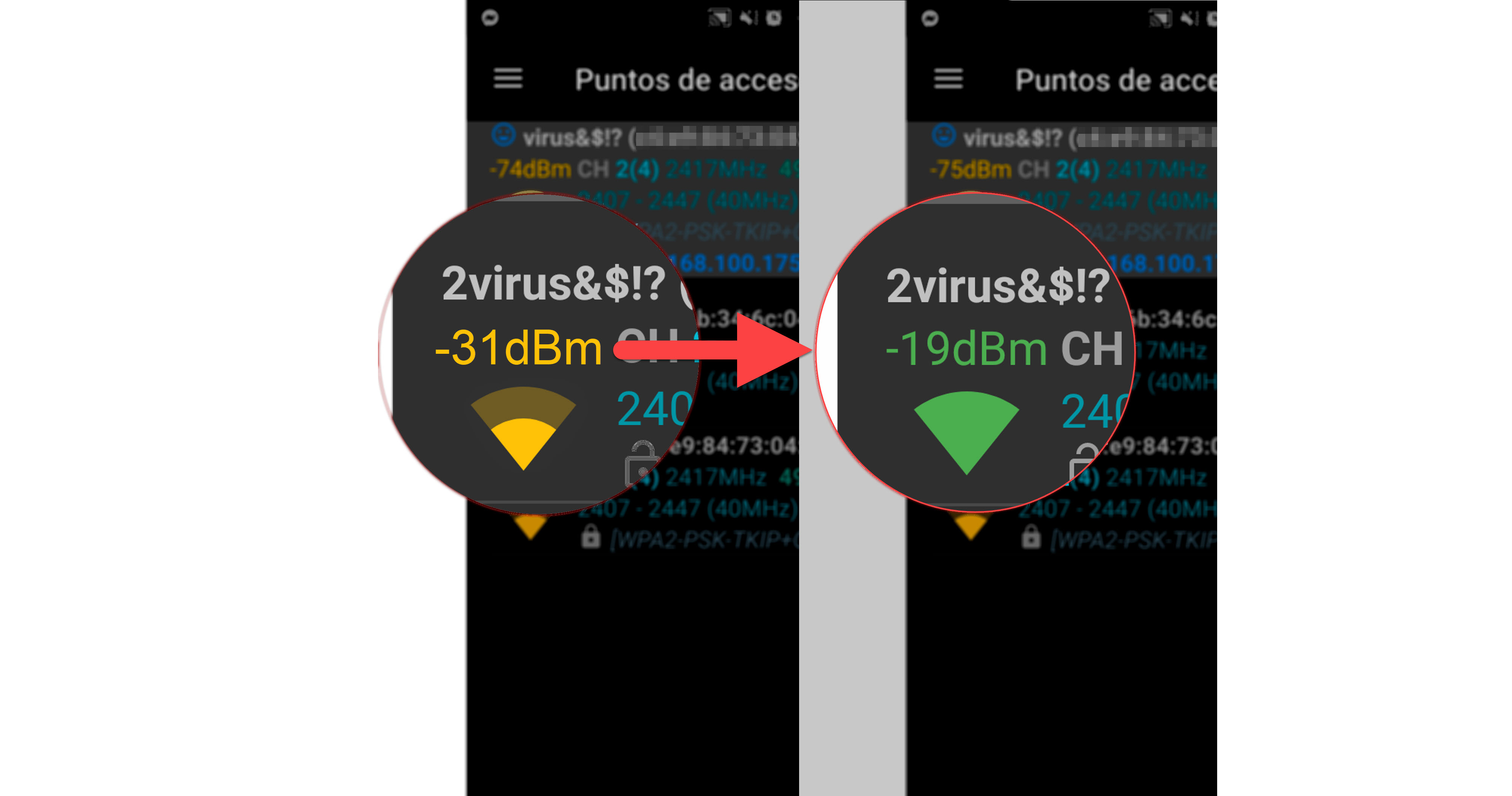 Imágenes arriba: Señal WiFi antes y después de aumentar la potencia de mi router con el firmware DD-WRT.