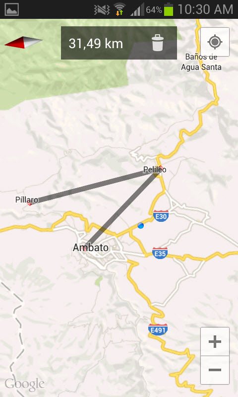 Se trata de Maps Measure, disponible gratis en este link, y es una herramienta imprescindible para quien depende bastante de Google Maps. Hace algo bastante simple pero muy necesario: medir o calcular la distancia entre dos o más puntos en el mapa. Todo es cuestión de tocar la pantalla en un punto inicial cualquiera y luego en un punto final. Inmediatamente se mostrará en la parte superior la distancia que hay entre esos dos puntos (en KM), hablando en línea recta, claro está. No brinda la distancia entre ambos puntos, por ejemplo, basándose en una ruta o carretera específica.