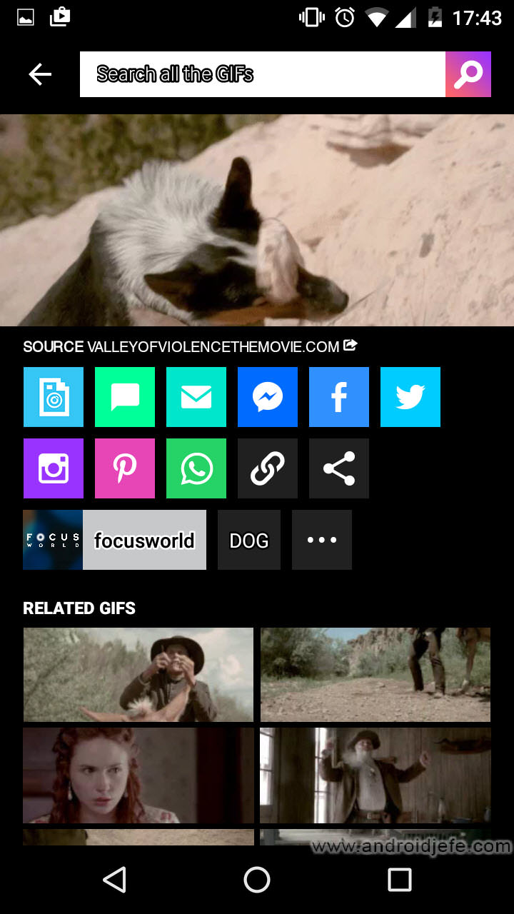 Adicionalmente, la app permite compartir una imagen GIF directamente en WhatsApp. Aquí el botón para enviar por WhatsApp sí está disponible. Gracias a esta característica ya no tienes que descargar el GIF para compartirlo por WhatsApp. Lo haces en un solo paso.