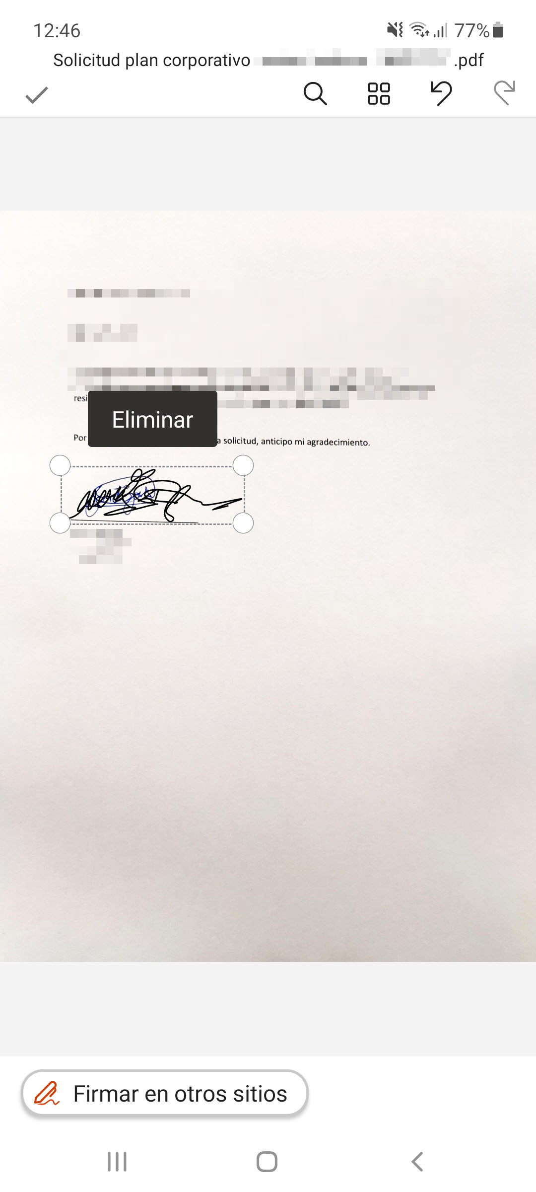 Otra función muy buena y que ahorra mucho tiempo es la que permite firmar documentos. Si no puedes poner la firma en un documento, lo que normalente deberías hacer sería imprimirlo, firmarlo con un bolígrafo y luego escanear el documento ya firmado para poder enviarlo.