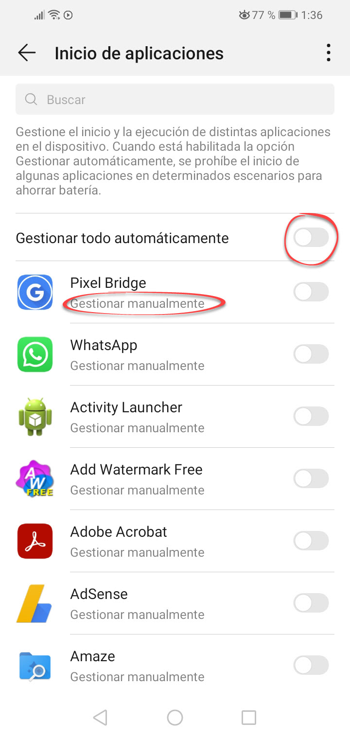 - Desactiva el interruptor que dice «Gestionar todo automáticamente», de modo que todas las aplicaciones queden con la opción «Gestionar manualmente». Si quieres mantener la gestión automática del arranque del resto de aplicaciones (excepto la que interesa), deberás activar individualmente su interruptor.