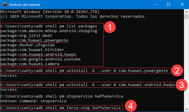 Si a pesar de haber hecho lo anterior, tu Huawei sigue cerrando las aplicaciones, deberás valerte del programa ADB para deshabilitar algunas aplicaciones de sistema que pueden estar generando este comportamiento. Los comandos a usar son los siguientes: