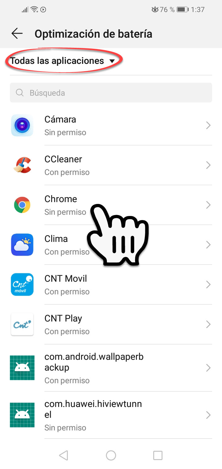 - Toca la opción que dice «Sin permiso» y deja seleccionada la opción «Todas las aplicaciones».