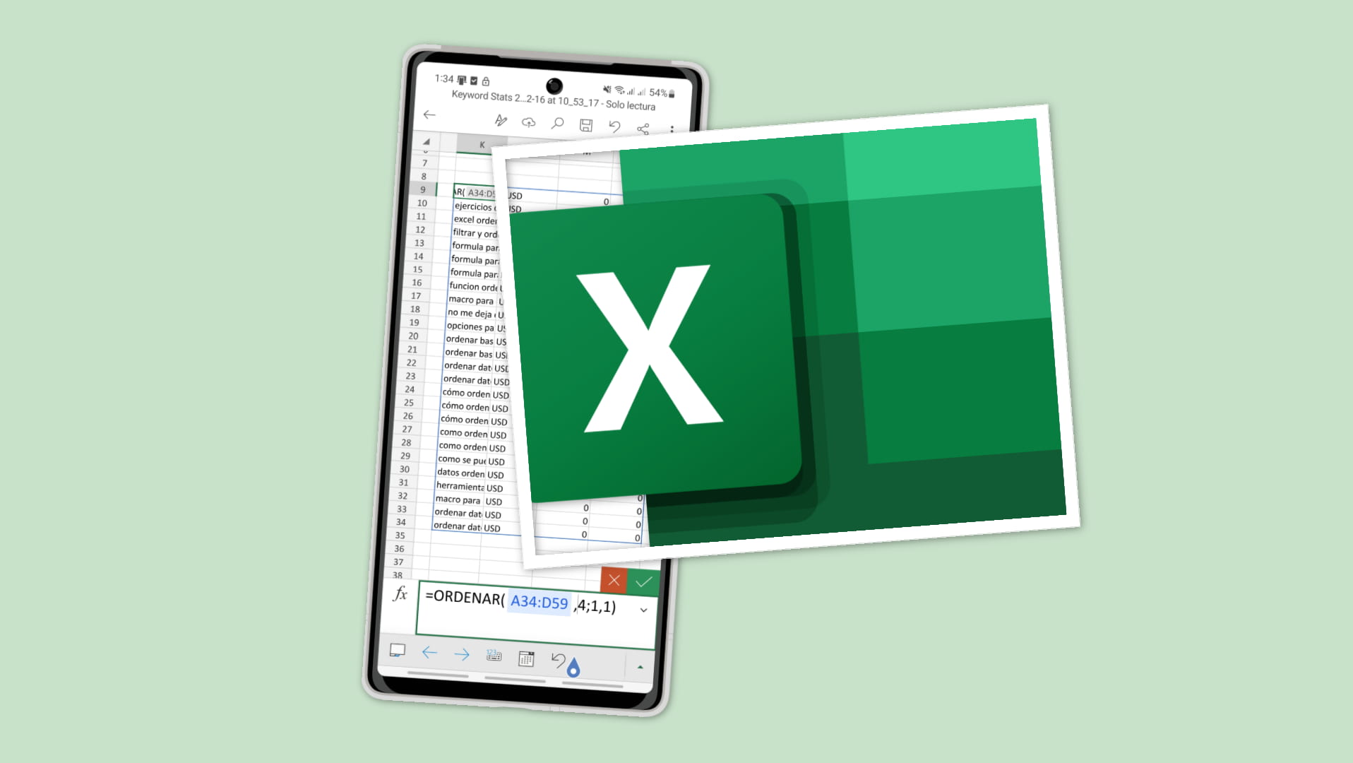 La sintaxis de la función ORDENAR en el Excel del celular es la siguiente (en la computadora, en vez de cada coma se usa punto y coma):