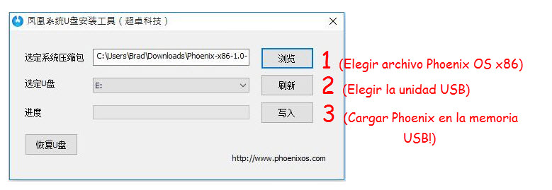 * Ejecutar el archivo USBMaker-X.X.X.exe y cargar o grabar el sistema Phoenix OS (x86) en la memoria USB de la forma que se indica en la imagen: