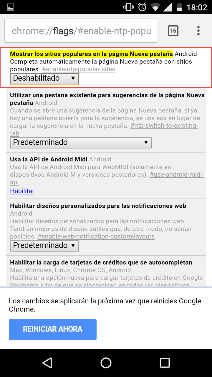 chrome://flags/#enable-ntp-popular-sites - Tocar el pequeño rectágulo abajo para cambiar la configuración: en vez de «Predeterminado» hay que dejar seleccionada la opción «Deshabilitado».