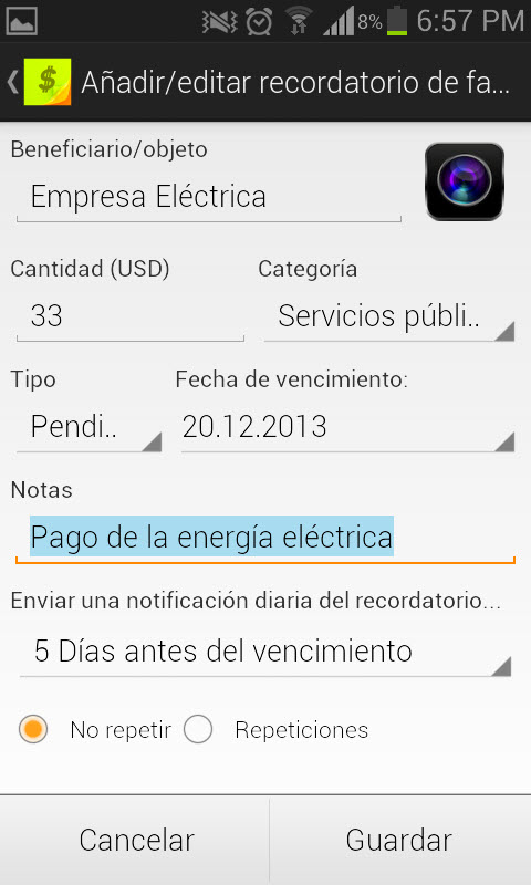 La aplicación está en español y es fácil entender cómo funciona. Simplemente se empiezan a agregar facturas, una por una. Para cada una se debe detallar el beneficiario del pago, la cantidad de dinero que hay que abonar o que está pendiente de pagar, fecha de vencimiento y antes de cuantos días del vencimiento se generará la notificación o recordatorio. También permite adjuntar la foto de la factura a cada ítem agregado, que puede servir para tener a la mano los detalles que se necesitan a la hora de pagarla.