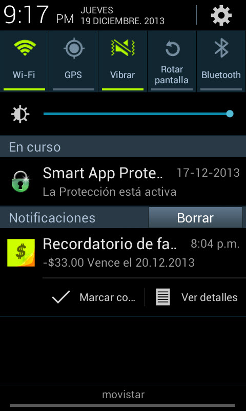 El recordatorio que genera la aplicación es una notificación mostrada en la barra de notificaciones de Android. Se presenta con el icono de la aplicación. Al abrir la notificación se podrá «Marcar como pagada», así como editar o borrar la factura.