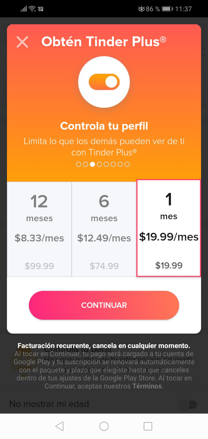 Si usas Tinder con frecuencia, tal vez quieras pagar por 6 meses o por un año de una sola vez. De esta manera ahorrarás dinero. Por ejemplo, en vez de pagar mes a mes por Tinder Plus durante 6 meses, el total sería 120 dólares (si eres mayor de 30 años, como indiqué). Si compras la suscripción semestral, el total sería 75 dólares. O sea te ahorras 45 dólares, una cantidad importante.
