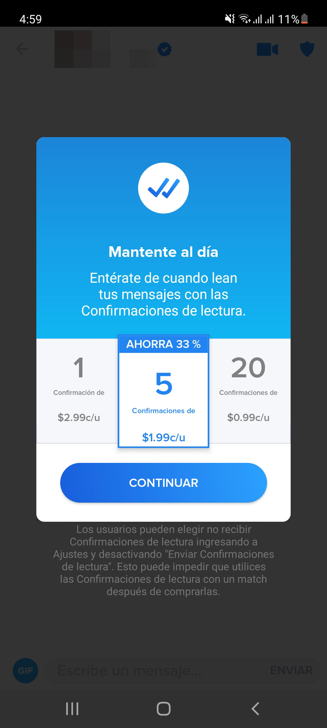 Las únicas funciones llamativas de Tinder de Gold y Platino es la de poder ver a quien le gustaste, para corresponder a su like y hacer match en ese momento para chatear, así como el boost que ya mencioné arriba. Pero como dije, es muy poco beneficio para el extremadamente alto precio de estas suscripciones. Es absurdo que, a pesar de llegar a pagar 40 dólares mensuales por Tinder Platinum (el valor que posiblemente pagas por los servicios básicos de tu casa), tengas también que comprarle a Tinder confirmaciones de lectura, como se ve arriba.